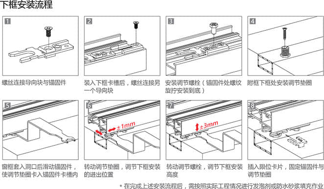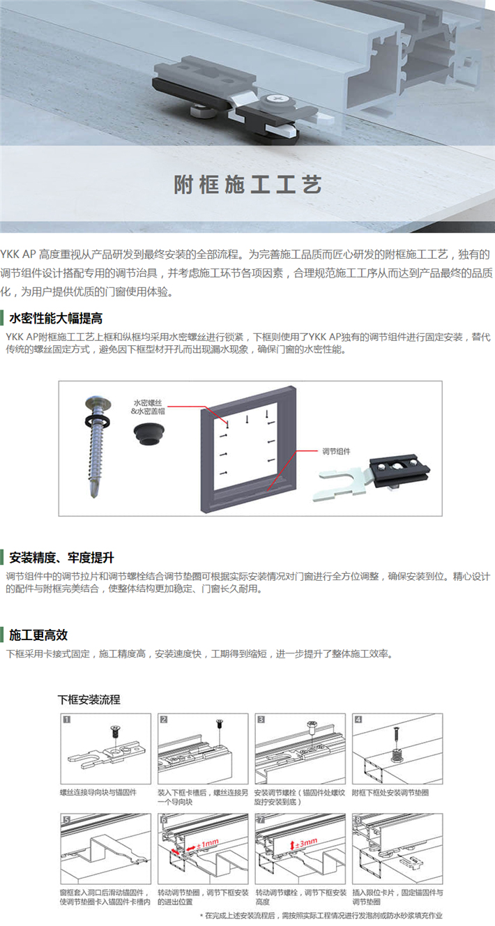 附框施工工藝上框和縱框均采用水密螺絲進(jìn)行鎖緊,下框則使用了永佳調(diào)節(jié)組件進(jìn)行固定安裝,替代傳統(tǒng)的螺絲固定方式,避免因下框型材開孔而出現(xiàn)漏水現(xiàn)象,確保門窗的水密性能。